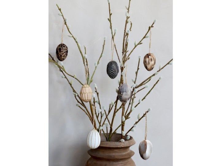 3 kpl ruskeasävyisillä höyhenillä päällystettyä koristemunaa Ripustusnarulla. koko 5x4cm.
