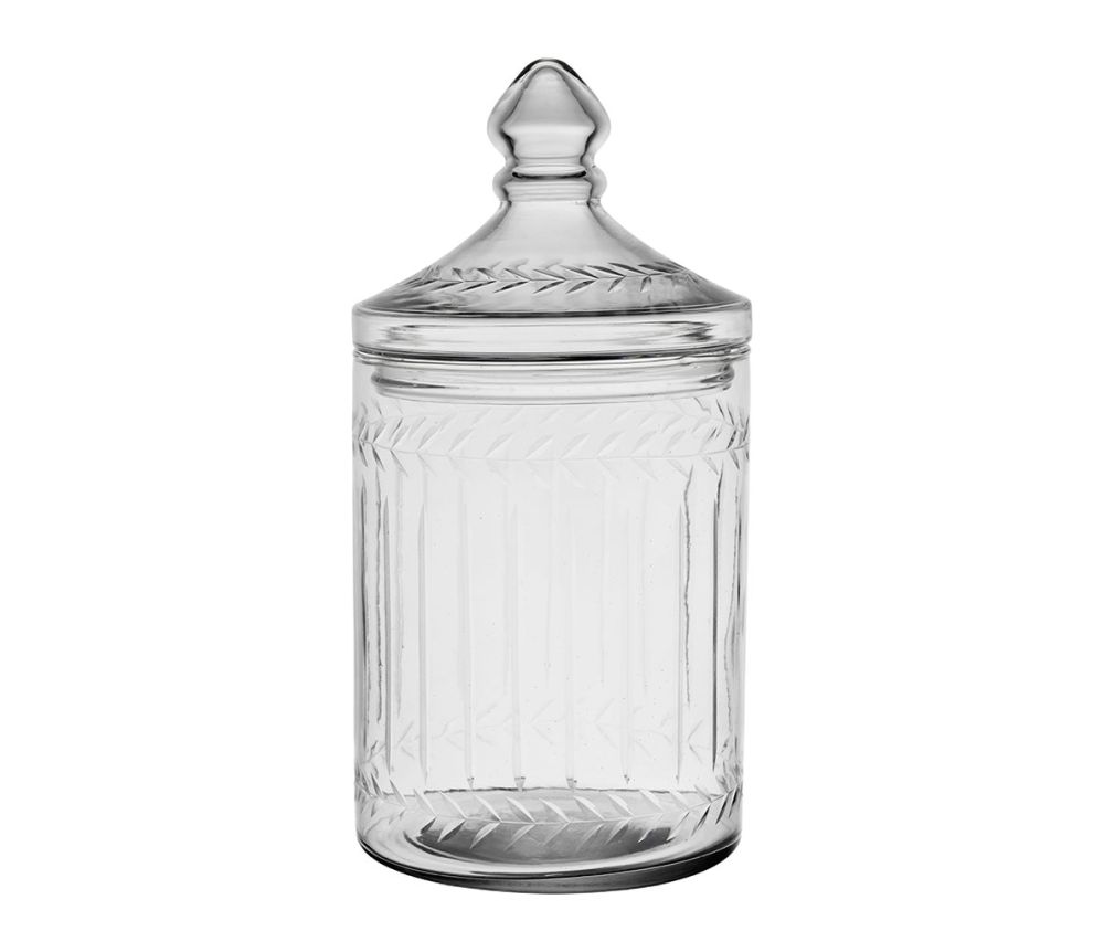 Kannellinen lasipurkki jossa kaiverrettu kuviointi. Mitat 13 x H25cm.