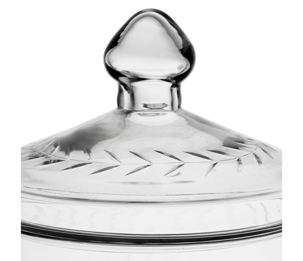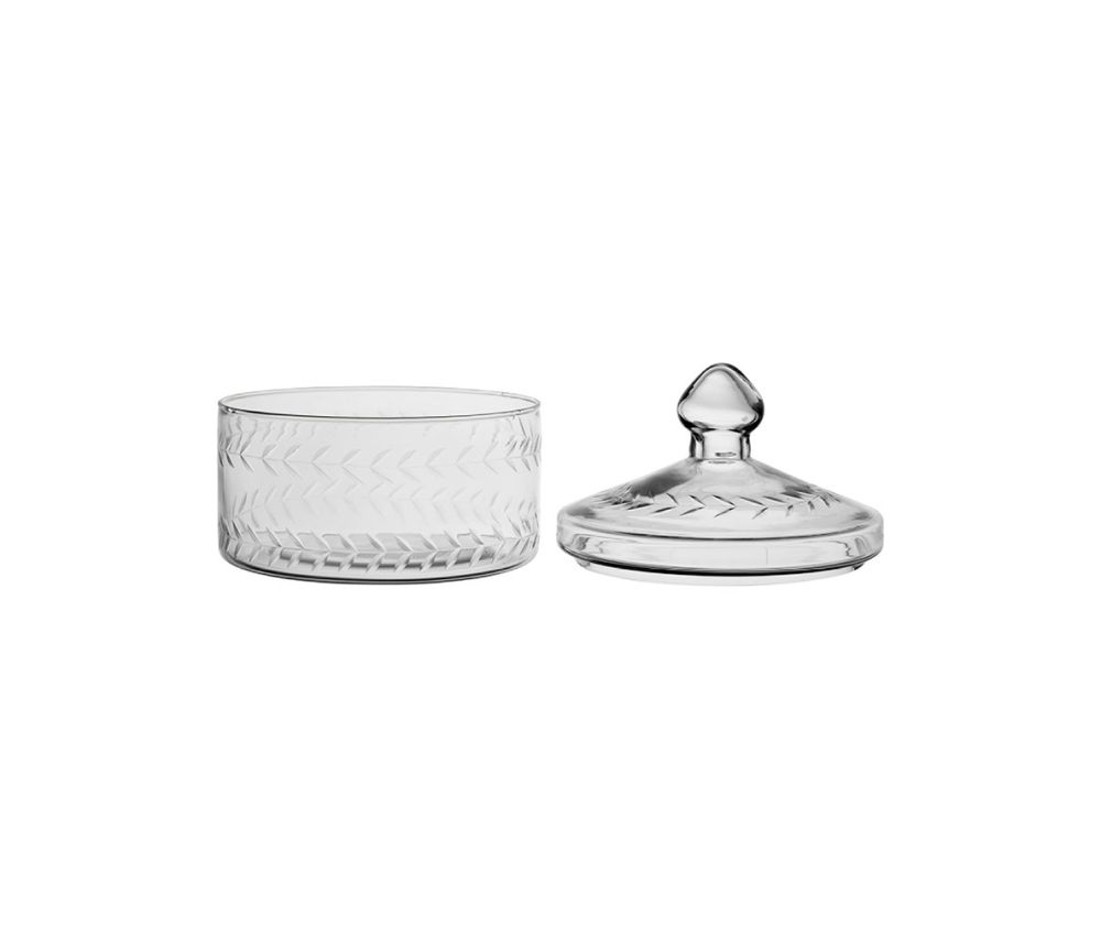Kannellinen lasipurkki jossa kaiverrettu kuviointi. Mitat Halk.14.5 x Kork.15cm