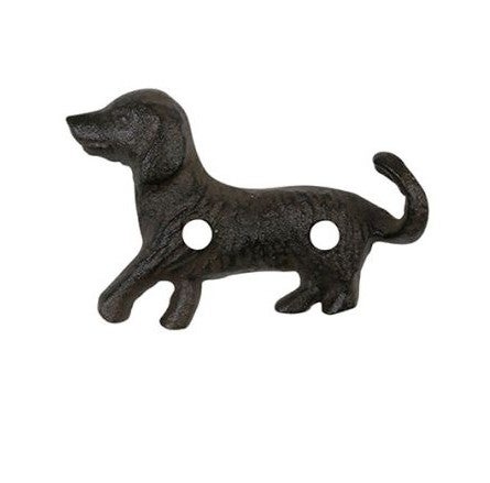 Valurautainen koiran muotoinen naulakko jossa häntä toimii koukkuna. Mitat 8 x 7 x 2cm. Ruskeaa valurautaa.