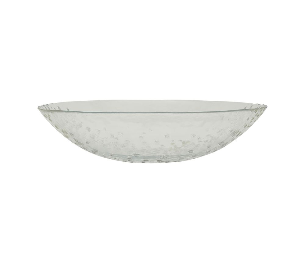 Lasinen salaattikulho jossa kullan ja hopeanvärisiä kohollaan olevia "pisaroita". Käsinpesu