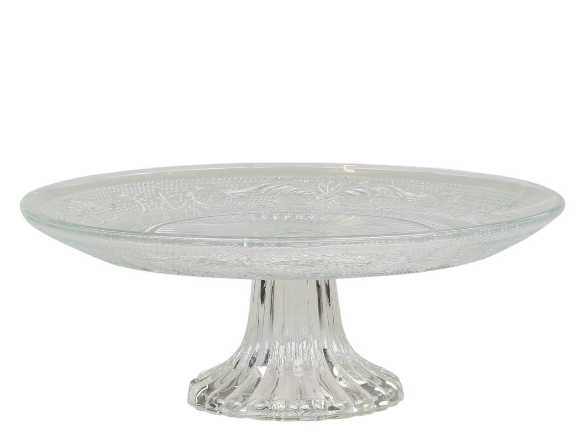 Kohikuvioitu lasitarjotin jossa jalka. Korkeus 7,5cm halk. 20cm.