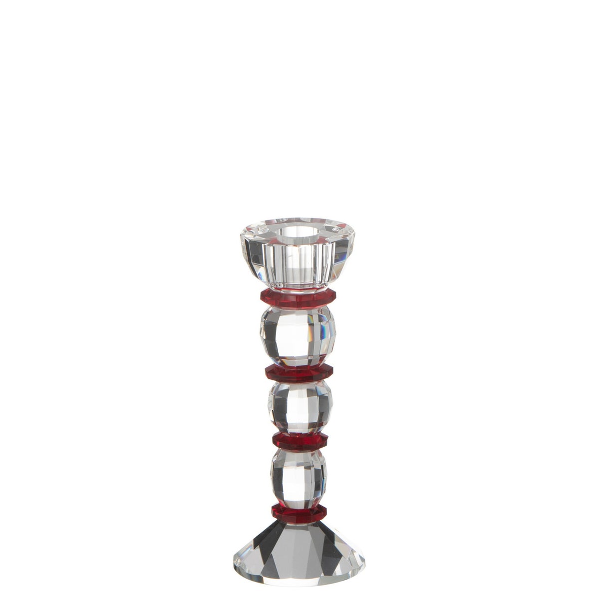Kristallikynttilänjalka jossa punaisset koristeet. 7x7cm, korkeus 18cm.